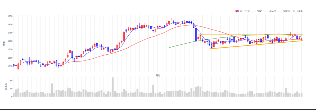 下値支持線は、右肩上がりに切りあがっており、上値抵抗線を抜けてくると大きな上昇が期待で