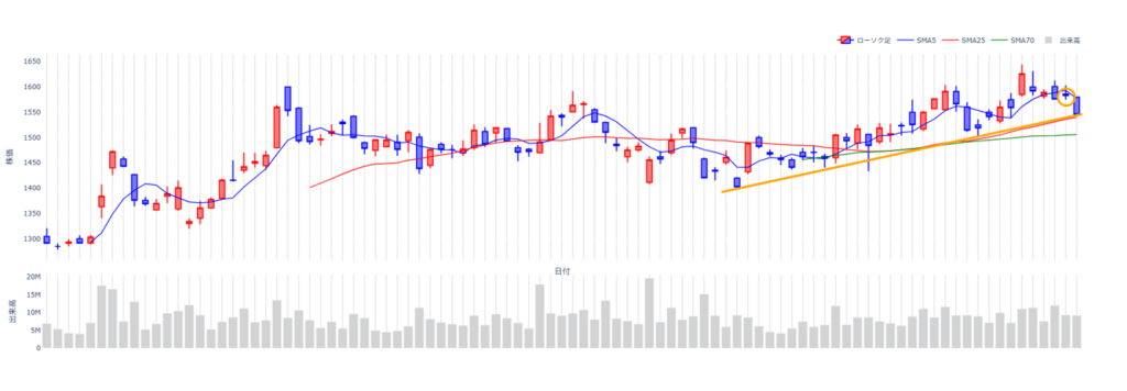 今後の相場予想ですが、1600円のラインに上値抵抗線が引けると思います。