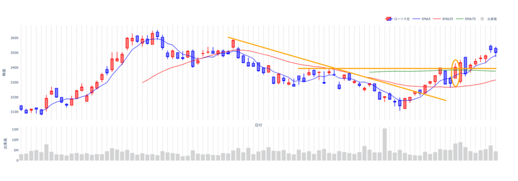 その後の高値である3700円を超えると、週足のレンジ相場を抜けるため更なる上昇を期待し